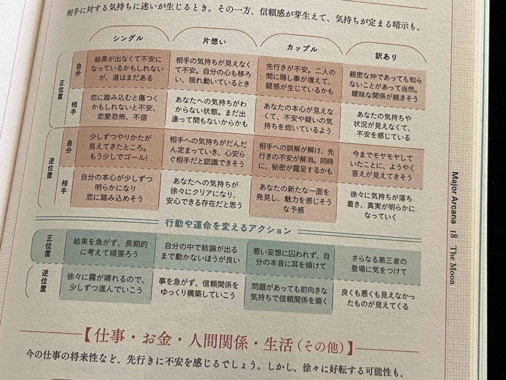 あらゆる占いごとに対して答えが書いてあるので、あまりこの本を頼りすぎると、リーディング(カードを読む)力が落ちる危険があります。