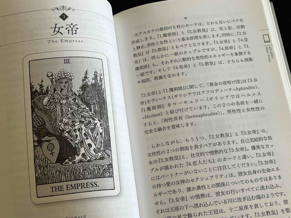 特に大アルカナの解説の部分は、カードに描かれている象徴と歴史学的な意味を絡めて解説しているので、非常に興味深く、楽しみながら読める解説書となっています。