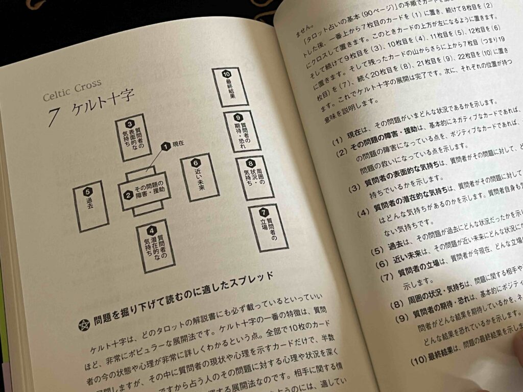 それで慣れてきたら、続編に掲載されているケルト十字やホロスコープなど、10枚以上のタロットカードを使ったスプレッドを試すというのが正解だと思います。